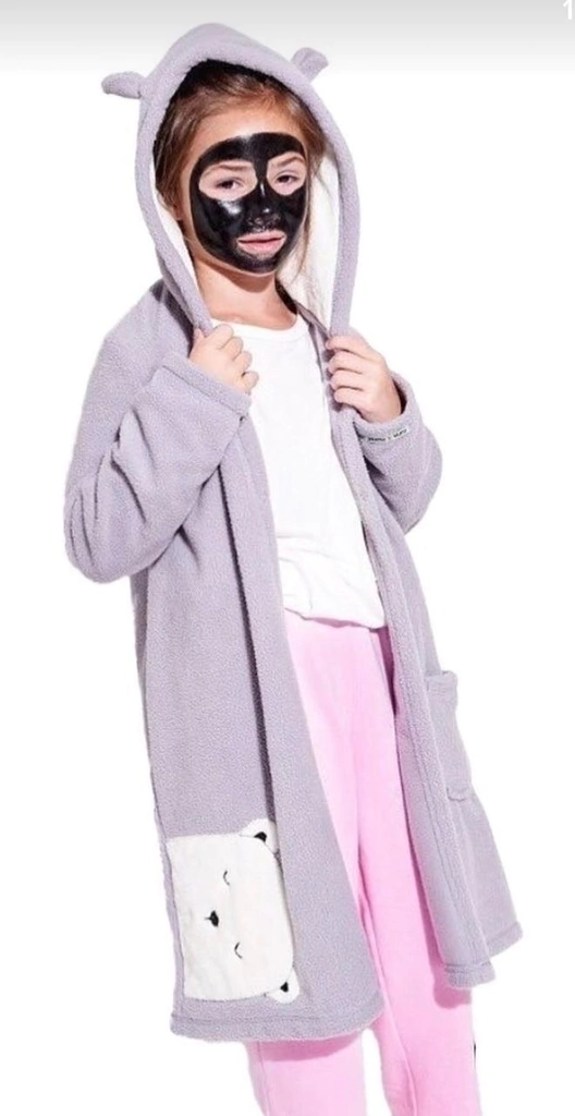 Bata polar gris con orejitas en la capucha y osito en tela bordado lateral