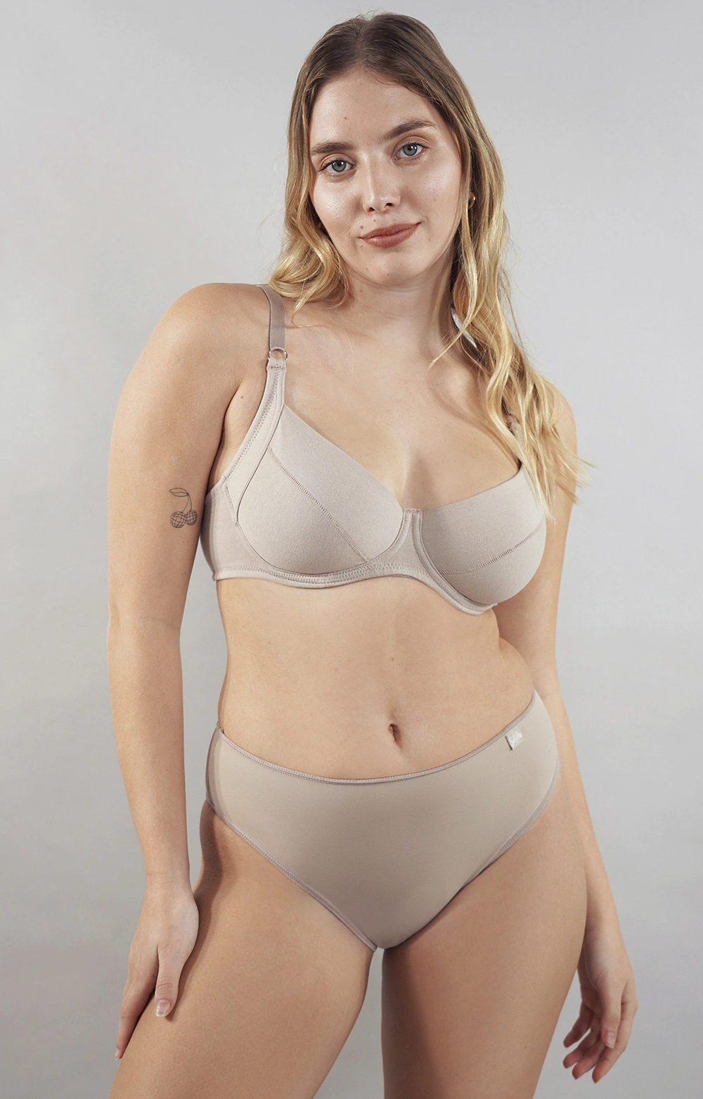 De algodón con elastano fibra LYCRA®. Doble tela en las tazas, que sujeta y controla perfectamente el busto. Elástico en el escote, que impide el desborde del busto. Doble refuerzo de sisa para sostener y modelar. Espalda con elástico ancho para lograr una mejor sujeción.